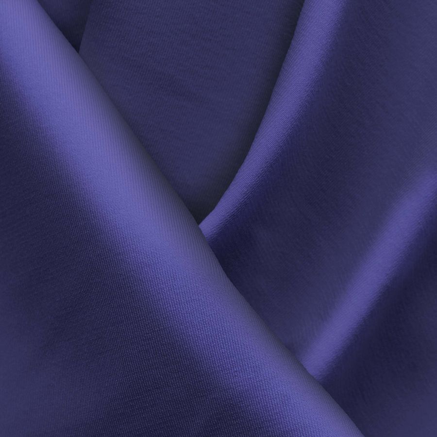 La tela base es la Lycra Reciclada - Seal de 230 gr/m2, compuesta por 75% poliéster y 25% elastano. El color liso impreso es morado/ noche azul, reflejando un CMYK de 94 89 28 19. Este tono se caracteriza por ser profundo y misterioso con una sensación nocturna, y combina perfectamente con tonos pastel, grises y dorados.