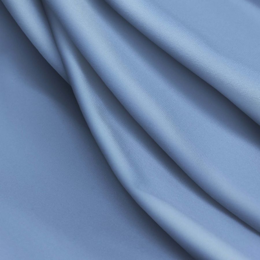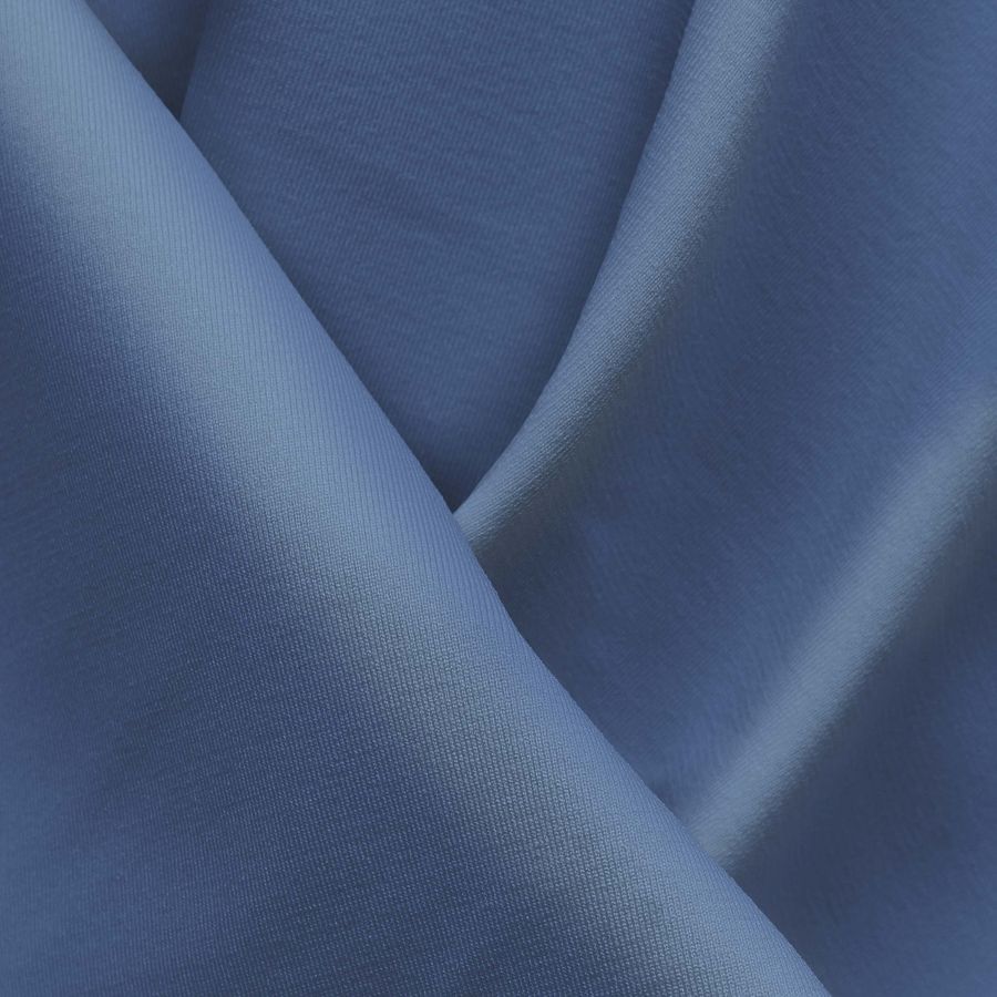 La tela base es Lycra Reciclada - Seal de 230 gr/m2 y su color liso es Azul aciano, con un CMYK de 62 41 8 0. Este color es luminoso y fresco, con una tonalidad suave y atractiva. Se combina muy bien con tonos tierra, beige y grises claros, destacando su frescura y elegancia. Cabe destacar que la tela está impresa con el color liso a una sola cara por impresión digital textil, lo que significa que el color no penetra completamente en la tela, permitiendo que la textura y el tacto sean más definidos.