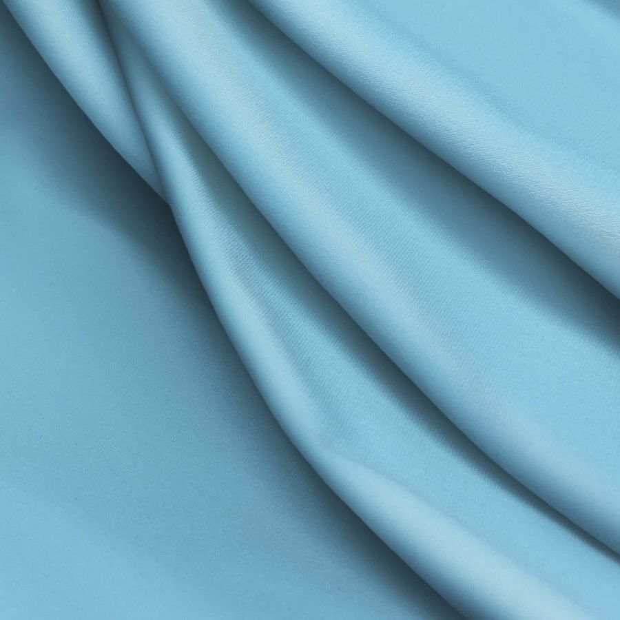 La tela base es Lycra Reciclada - Seal de 230 gr/m2, compuesta por un 75% de poliéster y un 25% de elastano. La tela tiene una textura elástica y un gramaje de 230 gr/m2. El color liso impreso es Azul Iceberg, cuyo CMYK es 56 13 6 0, lo que refleja la presencia predominante de cian en su composición. Es un color suave y fresco, que combina bien con tonos neutros y tierra.