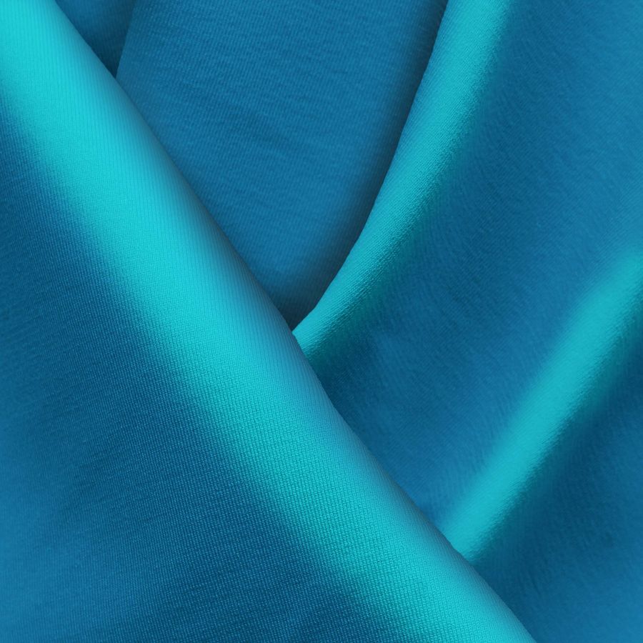 La tela base es Lycra Reciclada de 230 gr/m2 en color liso impreso en azul hiedra. El CMYK del color es 84-39-13-2 y su tonalidad es un azul verdoso intenso y fresco. Este color combina muy bien con tonos terrosos, grises y verdes boscosos. La tela está impresa a una sola cara por impresión digital textil, lo que significa que el color liso solo está en un lado de la tela y no es tintado sino impreso.