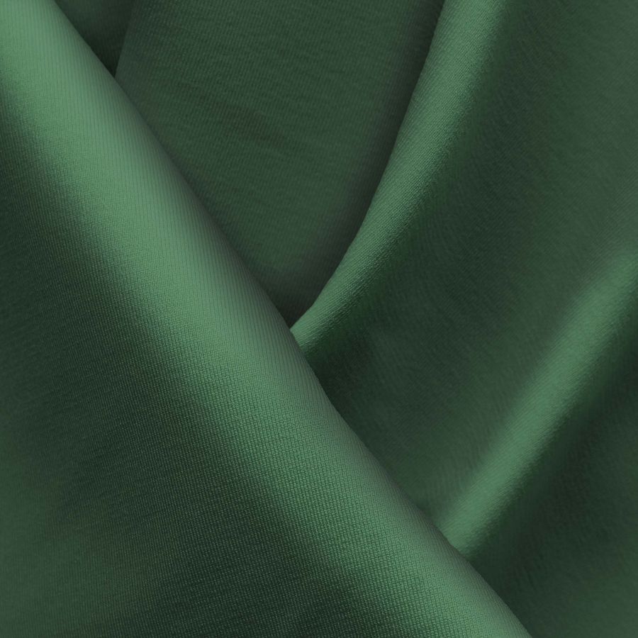 La tela base es la Lycra Reciclada - Seal de 230 gr/m2, compuesta por un 75% de poliéster y un 25% de elastano, con un gramaje de 230 gr/m2 y un ancho de 150 cm. El color liso impreso es de un verde bosque oscuro, indicado por los valores CMYK de 79, 45, 78 y 49. Este color es simbólicamente asociado con la naturaleza, la renovación y la estabilidad. Técnicamente, la combinación de cian, magenta, amarillo y negro lo hacen un color oscuro y profundo. Combina especialmente con tonos tierra, beige y neutros.