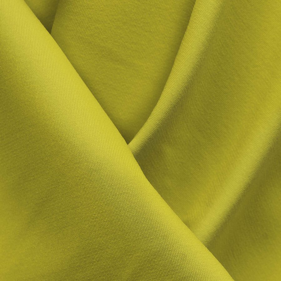 La tela base es la Lycra Reciclada - Seal de 230 gr/m2, compuesta por un 75% de poliéster y un 25% de elastano, con un gramaje de 230 gr/m2 y un ancho de 150 cm. El color liso impreso es amarillo canario con un CMYK de 9 0 81 0. Este color resalta por su luminosidad y vitalidad, transmitiendo energía y entusiasmo. Combina muy bien con otros tonos cálidos como el naranja y también con colores complementarios como el violeta.