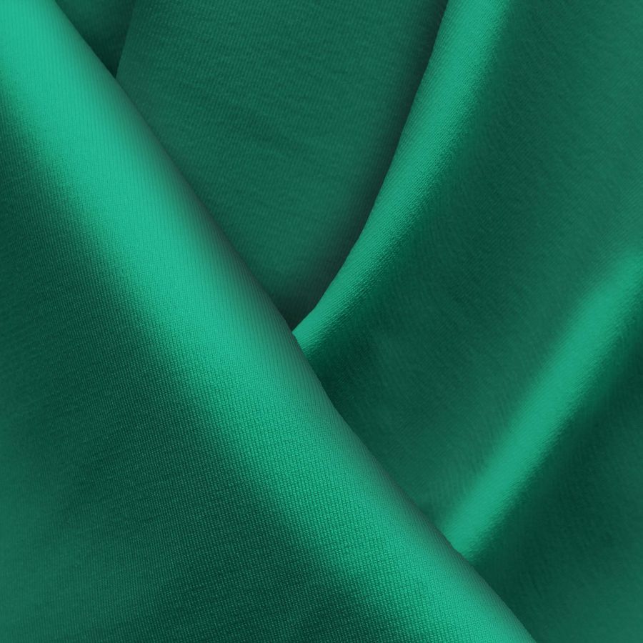 La tela base es la Lycra Reciclada - Seal de 230 gr/m2, con una composición de 75% poliéster y 25% elastano, con un gramaje de 230 gr/m2 y un ancho de 150 cm. El color liso impreso es un verde mar profundo con un contenido de CMYK de 88 31 74 22, y está impreso a una sola cara por impresión digital textil. Esta tela es elástica, resistente al cloro y tiene una protección UV muy alta de 50+.