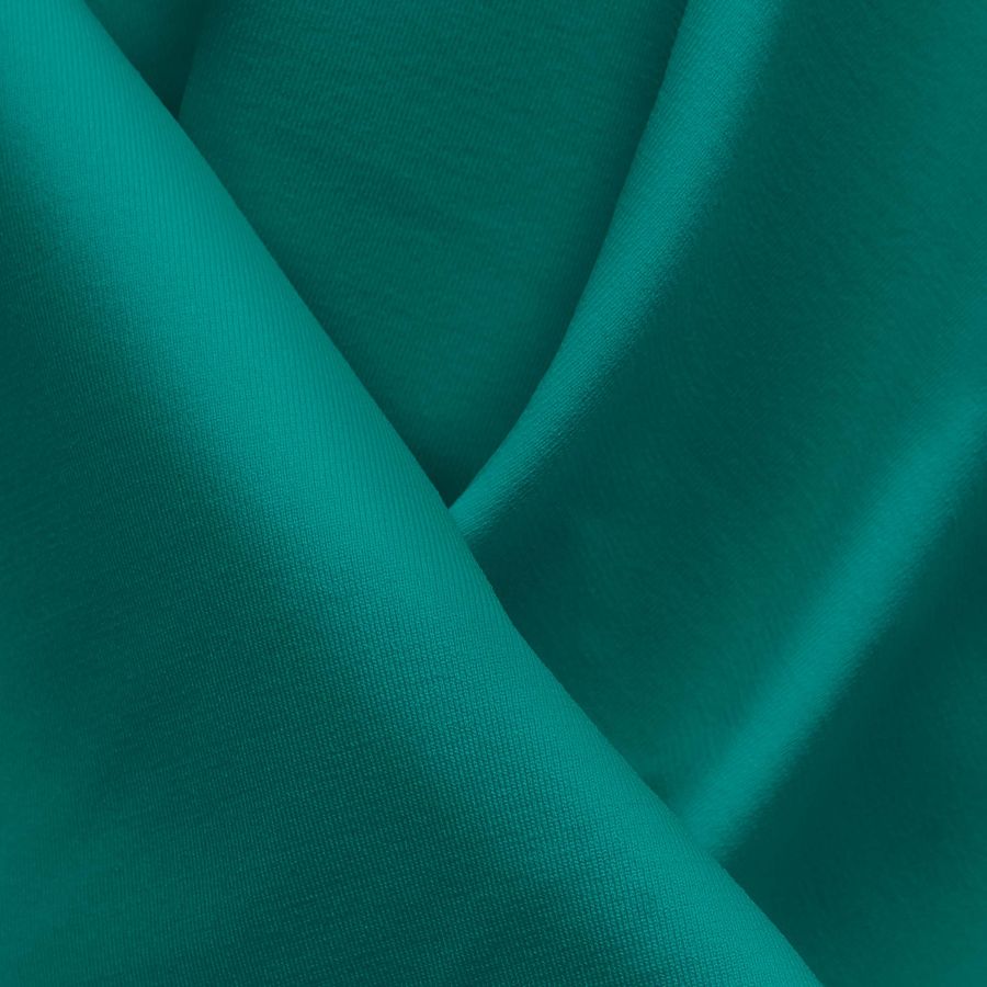 La Lycra Reciclada - Seal de 230 gr/m2 es una tela elástica de composición 75% POLIÉSTER y 25% ELASTANO, con un gramaje de 230 gr/m2 y un ancho de 150 cm. El color liso impreso en esta tela es un tono Espuma de mar verde con un CMYK de 81 18 50 3. Este color es fresco y suave, evocando la brisa del mar y la serenidad que éste transmite. Combina muy bien con tonos cremosos, beige y marrones claros; acentuando la sensación de calma y relajación.