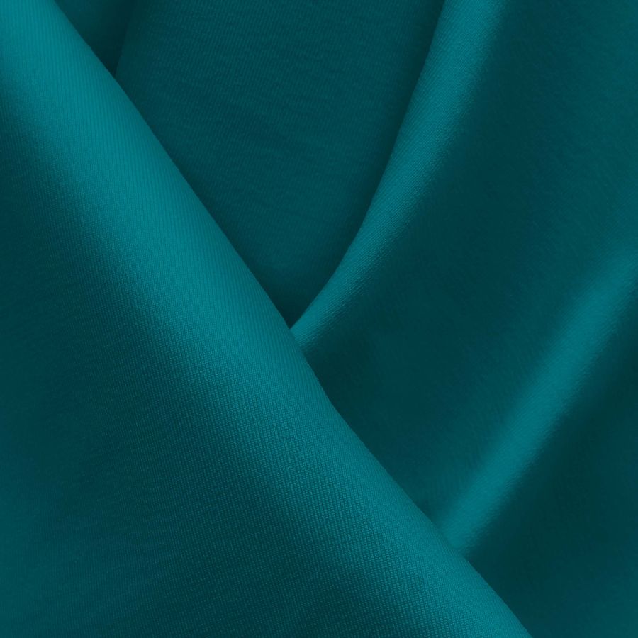 La tela base de este tejido es Lycra Reciclada - Seal de 230 gr/m2, compuesta por un 75% de poliéster y un 25% de elastano, con un ancho de 150 cm y un gramaje de 230 gr/m2. El color liso impreso es una combinación de verde y verde azulado, representado por un CMYK de 85 31 42 17. Este color secundario evoca la naturaleza y transmite una sensación de calma y equilibrio. Combinado con otros tonos verdosos, como el esmeralda o el oliva, crea un efecto armónico y relajante.