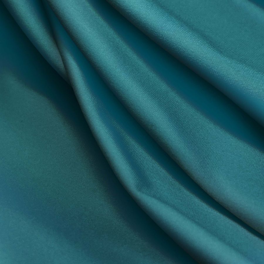 La tela base es la Lycra Reciclada- Seal de 230 gr/m2, una tela elástica y resistente compuesta por 75% poliéster y 25% elastano. El color liso impreso es un Verde Azulado Medio con valores en CMYK de 92, 49, 49, 44. Este color se caracteriza por ser fresco, relajante y evocar sensaciones de naturaleza y calma. Combina especialmente bien con tonos de marrón, beige, blanco y rosa pálido, logrando una armonía de tonos suaves y elegantes. La tela se imprime únicamente por una cara y por medio de impresión digital textil.