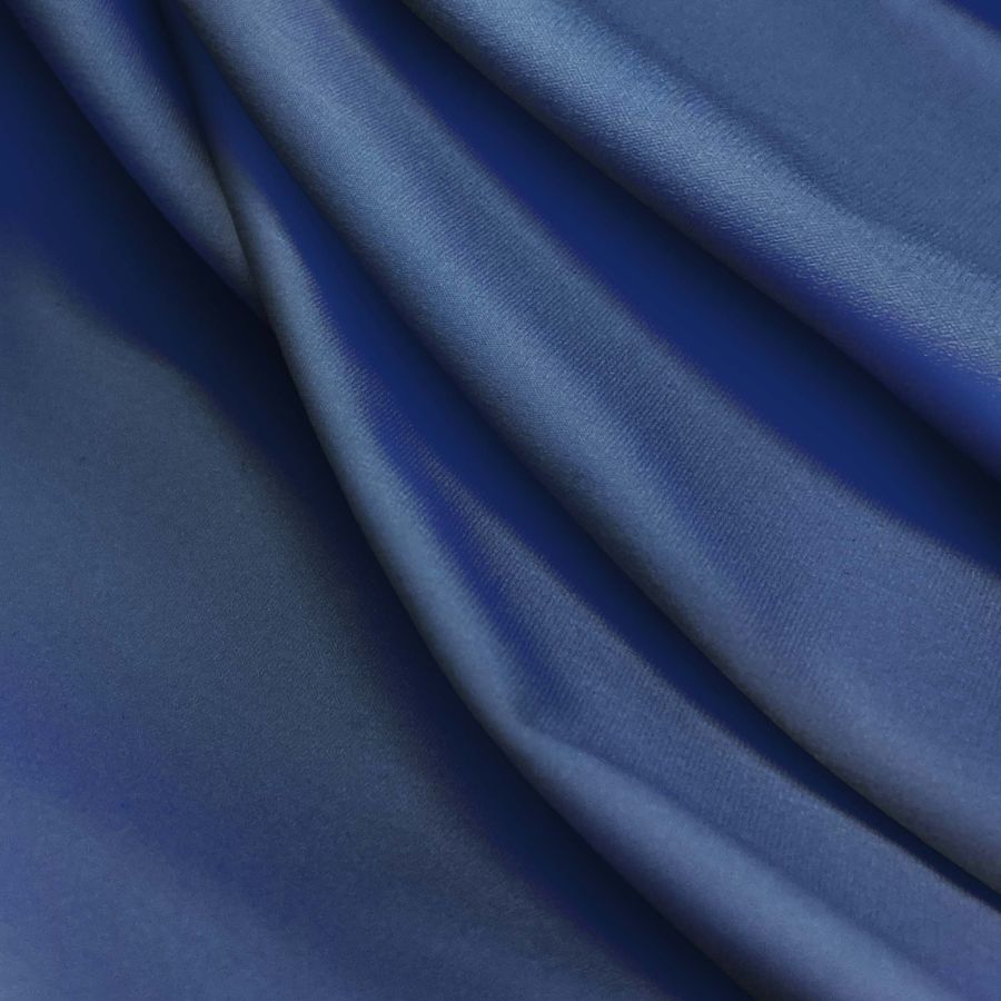 La tela base es Lycra Reciclada - Seal de 230 gr/m2, una lycra sostenible compuesta por 75% de poliéster y 25% de elastano con un gramaje de 230 gr/m2 y un ancho de 150 cm. El color liso impreso es de un profundo azul marino con una tinta cyan de 100, magenta de 84, yellow de 38 y black de 28, reflejando un CMYK de 100 84 38 28. Este color secundario simboliza la profundidad y misterio del océano, y técnicamente es resistente al cloro y tiene un factor de protección UV muy alto de 50+. Combina perfectamente con tonos azules más claros y grises fríos. Es importante destacar que el tejido está impreso con el color liso a una sola cara por impresión digital textil, lo que significa que no es un tejido tintado sino impreso por una sola cara.