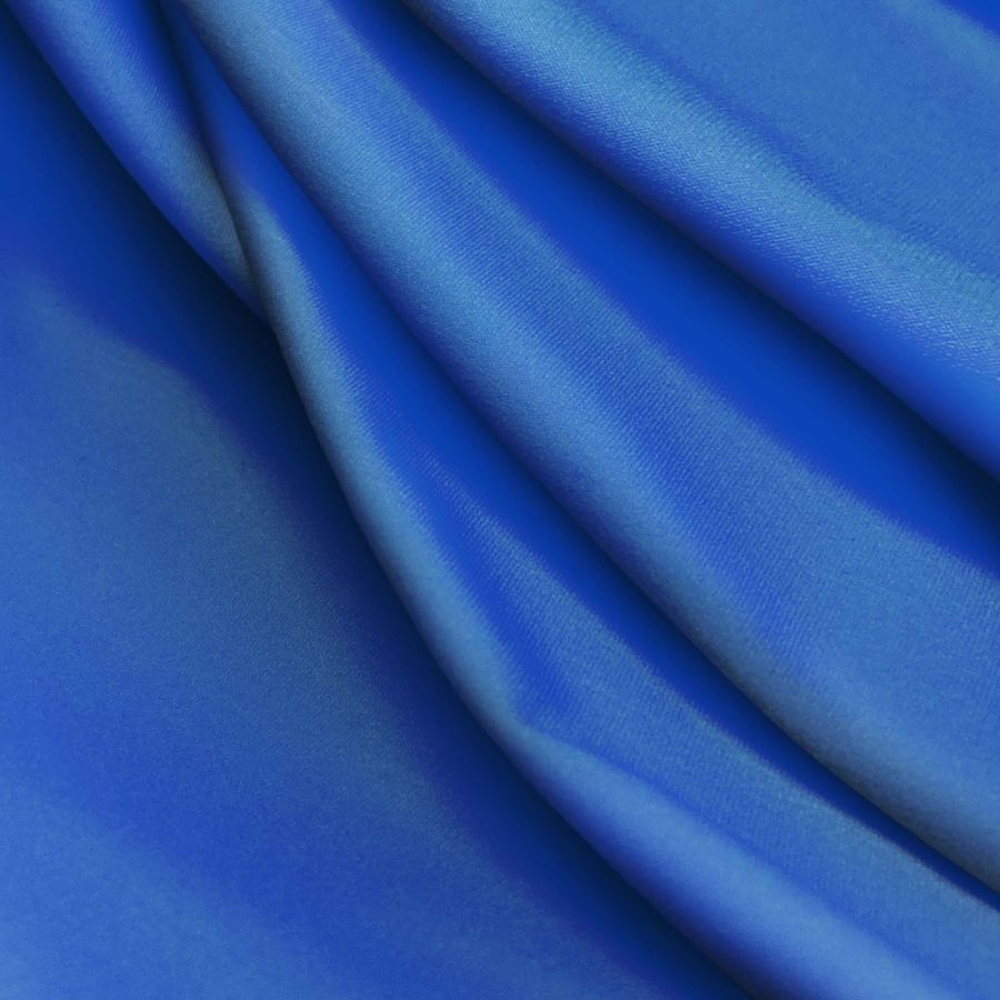 La tela base es Lycra Reciclada - Seal de 230 gr/m2, compuesta por 75% de poliéster y 25% de elastano. El color liso impreso es un tono de azul, con tinta cyan al 100%, magenta al 77%, yellow al 18% y black al 4%. Este color secundario puede describirse como un azul arándano, con un tono intenso y vibrante. Combina perfectamente con tonos de rojo, naranja, amarillo y verde, creando una paleta de colores audaz y llamativa. Es importante destacar que el tejido está impreso con el color liso a una sola cara por impresión digital textil, que no es un tejido tintado sino impreso por una sola cara.