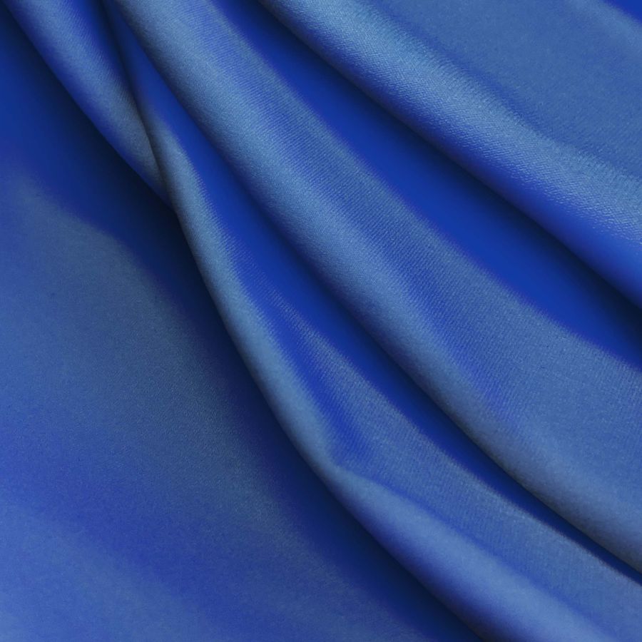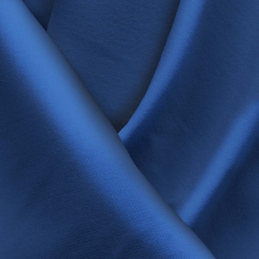 La tela base es la Lycra Reciclada - Seal de 230 gr/m2, compuesta por un 75% de poliéster y un 25% de elastano. El color liso impreso es un azul intenso, similar al lapislázuli, que se consigue a través de una combinación de tintas CMYK de 100% cian, 81% magenta, 25% amarillo y 9% negro. Este color armoniza con tonos cálidos como el naranja y el amarillo, además de combinar bien con colores fríos como el verde turquesa y el morado.