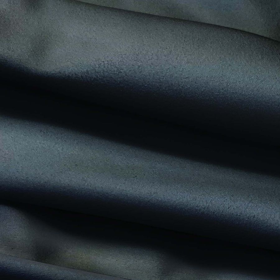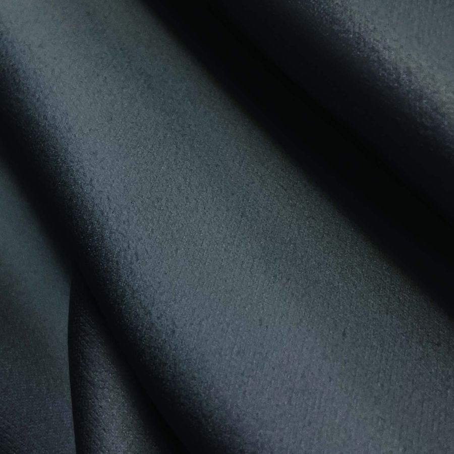 La tela base de esta prenda es la microfibra para toalla Swing, un tejido de microfibra de composición 100% poliéster, con un gramaje de 200 gr/m2 y un ancho de 160 cm. En cuanto al color liso impreso, se trata de un negro medianoche con un CMYK de 79 62 54 61, un color profundo e intenso que combina perfectamente con tonos grises y plateados. La tela está impresa a una sola cara por impresión digital textil.