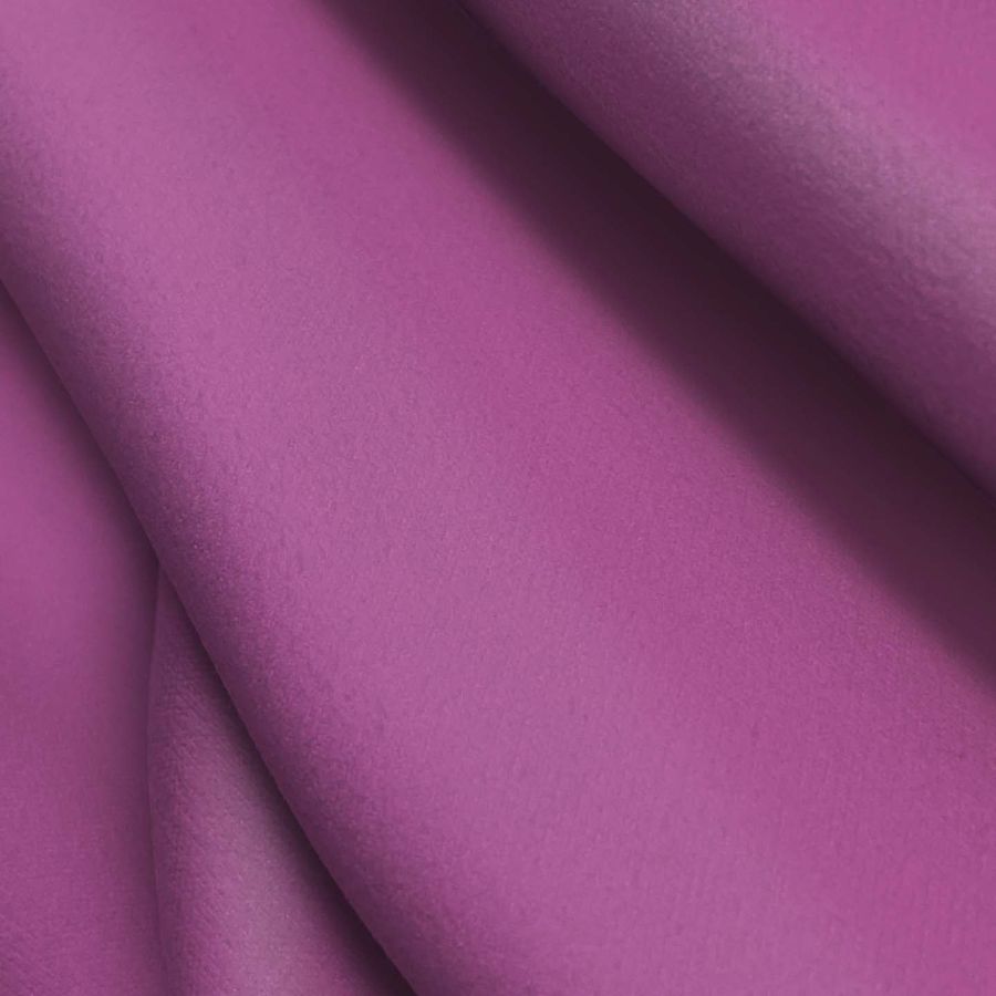 La tela base de este tejido es una microfibra de 100% poliéster con un gramaje de 200 gr/m2 y un ancho de 160 cm. El color liso impreso es un orquídea mediana con un CMYK de 34 75 6 0. Se trata de un color intenso y vibrante, que combina muy bien con tonos más suaves como el lavanda o el gris claro, y con tonos más fluorescentes como el amarillo o el verde lima. Cabe destacar que la tela está impresa con el color liso a una sola cara por impresión digital textil, lo que nos permite obtener una alta calidad y definición en la impresión.