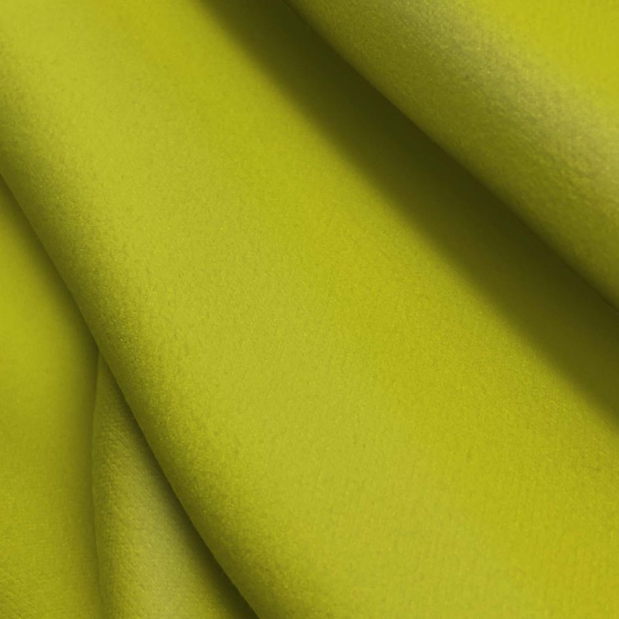 La tela base es una microfibra para toalla de 100% poliéster, con un peso de 200 gr/m2 y un ancho de 160 cm. El color liso impreso es un verde ácido, que se obtiene a partir de una combinación de tintas CMYK con 31 de cyan, 13 de magenta, 96 de yellow y 2 de black. Este llamativo color se combina bien con otros verdes más oscuros y con tonos cálidos como el amarillo.