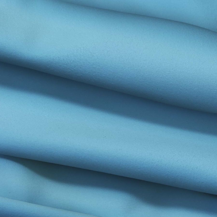 La tela base es Microfibra para Toalla - Swing, una microfibra de 100% poliéster de 200 gr/m2 con un ancho de 160 cm. El color liso impreso es Azul Iceberg con un CMYK de 59 14 4 0, lo que indica una tonalidad de azul claro con una ligera presencia de magenta y amarillo. Este color secundario simboliza la tranquilidad, la frescura y la serenidad, y combina particularmente bien con colores como el blanco, el gris, el rosa pálido y el verde menta. La tela está impresa con este color liso a una sola cara por impresión digital textil, lo que significa que no es teñida sino impresa por una sola cara.