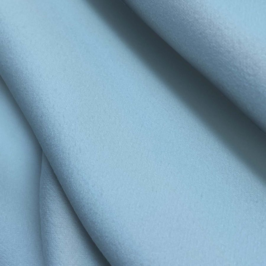 La tela base de esta prenda es de microfibra para toalla, con una composición de 100% poliéster y un gramaje de 200 gr/m2. Su ancho es de 160 cm y su color liso impreso es un azul claro del día, con los siguientes valores de CMYK: 41 8 2 0. Este color evoca tranquilidad, confianza y fidelidad. El azul claro combina especialmente bien con tonos pastel, como rosa pálido o amarillo suave.