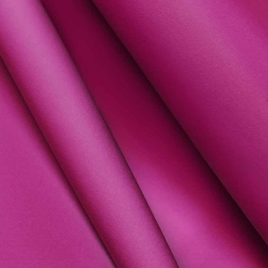La tela base es el Poliéster Reciclado Deportivo - Basic, compuesta por un 93% de poliéster y un 7% de elastómero con un gramaje de 145 gr/m2 y un ancho de 145 cm. El color liso impreso en la tela es un Morado-Ciruela morada, cuyo CMYK es de 34 100 21 13. Este tono se caracteriza por ser un color oscuro y profundo de matiz frío y tonalidad rojiza. El color secundario que resalta en este tono es el azul, lo cual crea una mezcla interesante y equilibrada que resalta la personalidad de la tela. En combinación con otros colores, el morado se realza con tonos cálidos como el amarillo, el naranja y el rosa.