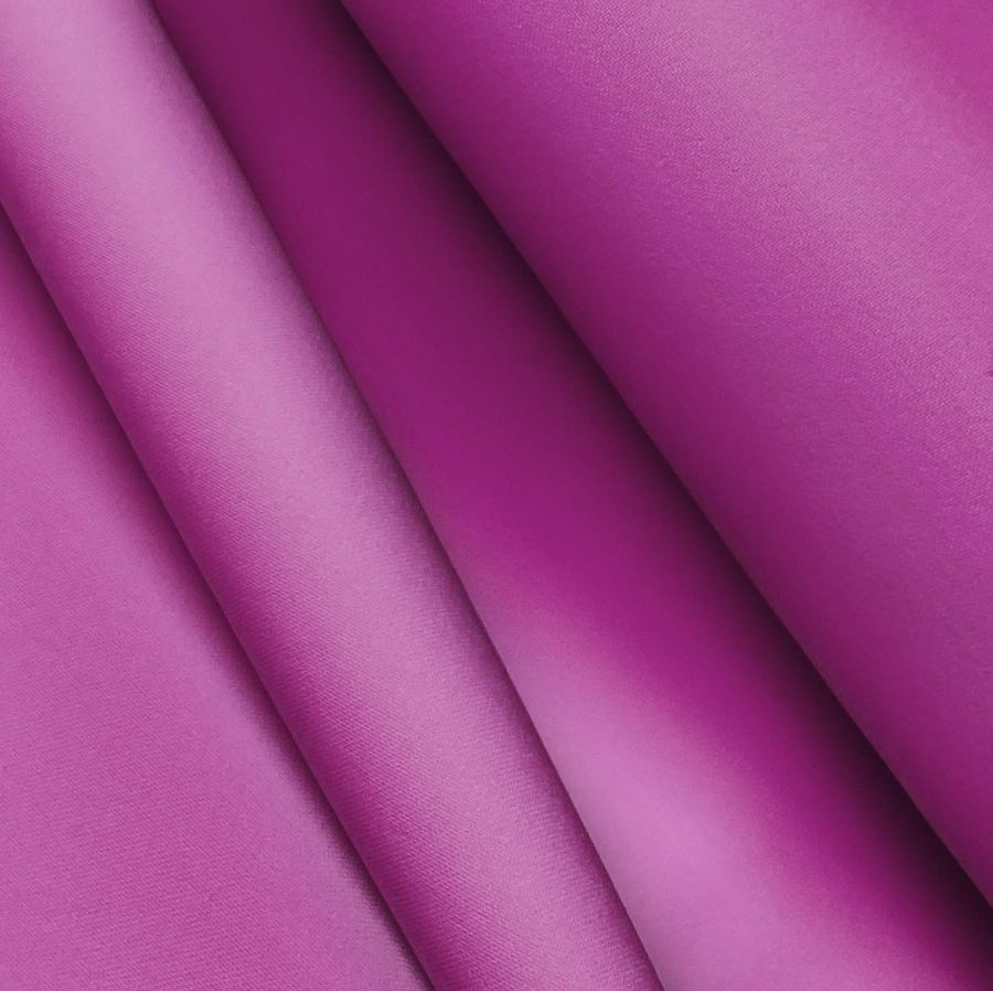 La tela base es el Poliéster Reciclado Deportivo - Basic, compuesta por un 93% de poliéster y un 7% de elastómero, con un gramaje de 145 gr/m2 y un ancho de 145 cm. El color liso impreso es una mezcla de morado y ciruela rosa, con una combinación de tinta cian de 38, magenta de 87, amarilla de 2 y sin tinta negra (CMYK: 38 87 2 0). Este color secundario es profundo y vibrante, evocando un toque de misterio y sofisticación. Es excelente para crear contraste con otros colores, en particular con tonos oscuros como el negro y azul marino, así como con tonos cálidos como el rosa y el naranja.