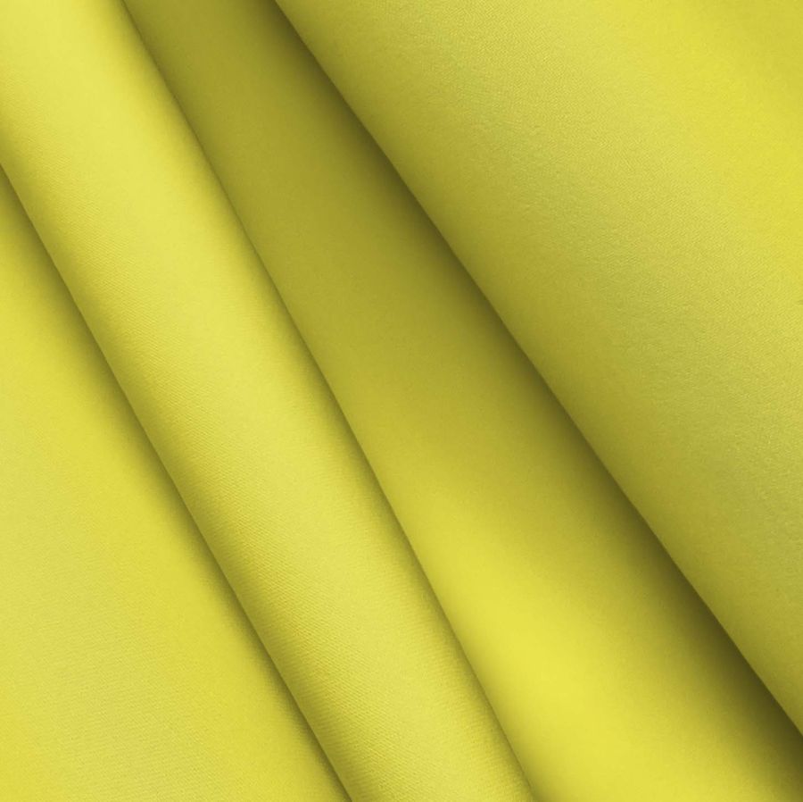 La tela base es Poliester Reciclado Deportivo - Basic, con una composición de 93% poliéster y 7% elastómero, y un gramaje de 145 gr/m2. El color liso impreso es amarillo canario, con un CMYK de 9 0 81 0. Este color es vivo y luminoso, evocando el sol y la energía. Combina especialmente bien con tonos azulados, verdes obscuros y blanco. La tela está impresa con este color liso a una sola cara por impresión digital textil.