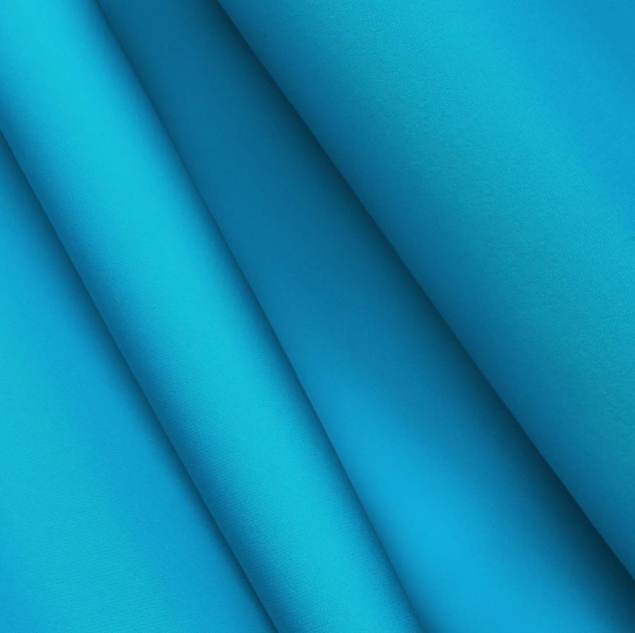 La tela base es Poliester Reciclado Deportivo - Basic, compuesta por 93% Poliéster y 7% Elastómero, con un gramaje de 145 gr/m2, ancho de 145 cm, y certificada por GRS como reciclada y sostenible. El color liso impreso es Azul/Azul neón, con un CMYK de 76 23 1 0. Este color secundario presenta una fuerte presencia visual, simbolizando la libertad y la tranquilidad del agua en tonalidades turquesas verdosas, y combina especialmente bien con tonos neutros como el blanco y el gris claro, así como con naranjas, amarillos y azules claros.