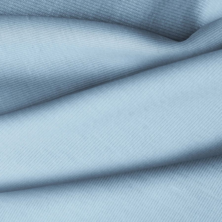 La tela base, Punto Camiseta - Vanity, es de composición 95% poliéster y 5% elastómero, con un color liso impreso en tonalidades de Azul Koi, representado por 49% Cyan, 24% Magenta, 13% Yellow y 1% Black en el CMYK. Este color secundario simboliza la calma y la serenidad, recordando al agua y a la naturaleza. Combina especialmente bien con tonos neutros como blanco, gris y beige, así como con colores similares en la gama de azules y verdes.