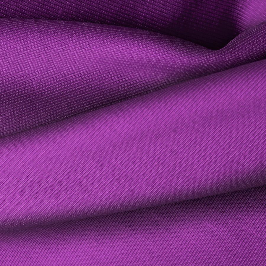 La tela base de Punto Camiseta - Vanity es de color Morado/Púrpura, con una composición de 95% POLIÉSTER y 5% ELASTÓMERO, reflejando un color liso impreso con CMYK: 65 98 9 2. Este tono se caracteriza por su intensidad y profundidad, evocando elegancia y misterio. Combina especialmente bien con colores neutros como blanco, negro o gris, resaltando así su tonalidad única.