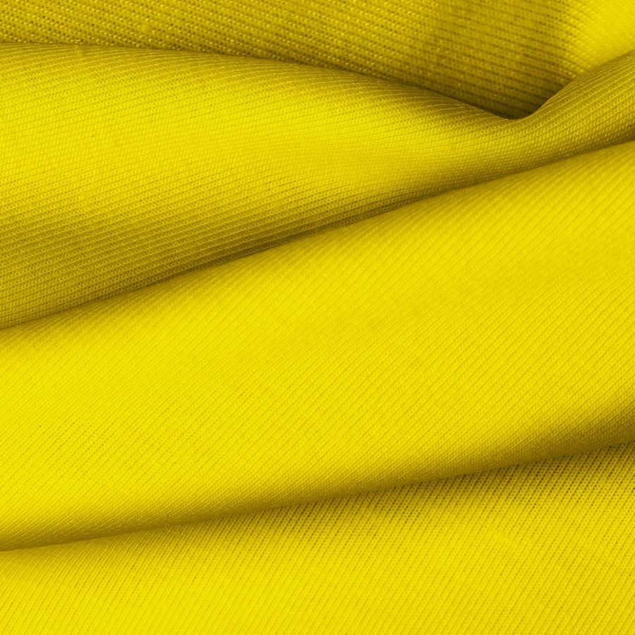 La tela base Punto Camiseta - Vanity es de un amarillo profundo, con un CMYK de 9 23 96 1. Este color simboliza la energía y la luminosidad, ideal para prendas llamativas. Combina perfectamente con tonos neutros como el blanco, gris y negro, resaltando su intensidad.