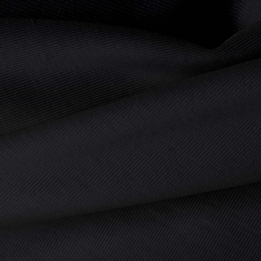 La tela base, Punto Camiseta - Vanity, es de color negro noche, con un CMYK de 93 80 59 95. Este color liso impreso se caracteriza por ser profundo, elegante y sofisticado, combinando perfectamente con tonos dorados, plateados y blancos para crear un contraste llamativo.