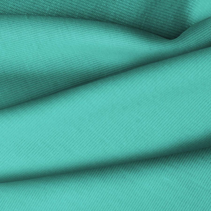 La tela base es una Punto Camiseta de Vanity en color Verde Espuma de mar, con un CMYK de 71 15 47 2. Este color transmite serenidad y frescura, perfecto para prendas de moda casual y deportiva. Combina especialmente bien con tonos neutros como blancos, grises y negros.