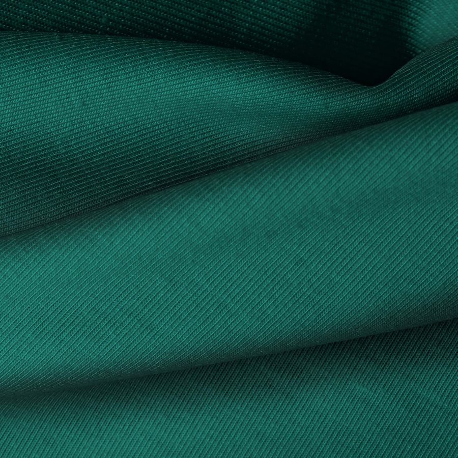 La tela está impresa con el color liso a una sola cara por impresión digital textil, lo que le brinda un acabado de alta calidad y durabilidad. La textura suave y elástica de la tela base se complementa perfectamente con el color verde teal profundo, creando una combinación elegante y moderna.