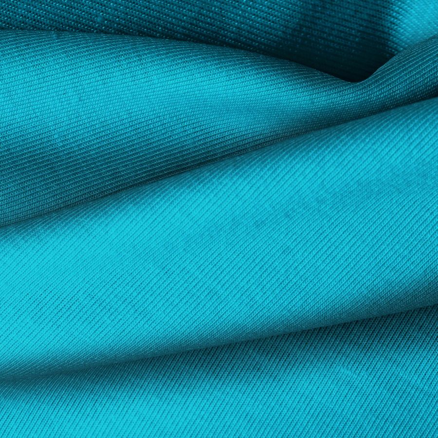 En cuanto a las características, la tela base es suave y elástica al tacto, lo que la hace ideal para prendas cómodas y que se ajusten bien al cuerpo. El color Azul Hiedra añade un toque de frescura y originalidad a cualquier diseño, destacando por su intensidad y luminosidad.