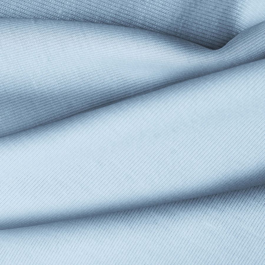 La tela base, Punto Camiseta - Vanity, es de punto con una composición de 95% poliéster y 5% elastómero. El color liso impreso es Azul Iceberg, con un CMYK de 40 15 2 0. Este color refleja tranquilidad y frescura, combinando bien con tonos neutros como blanco y gris.