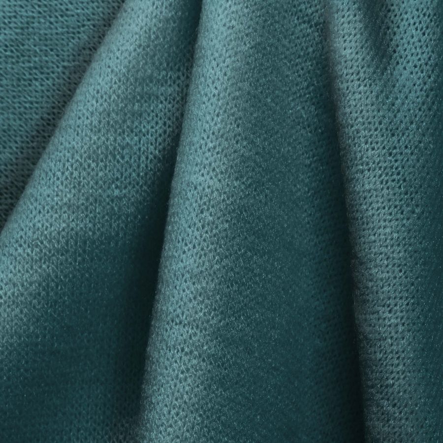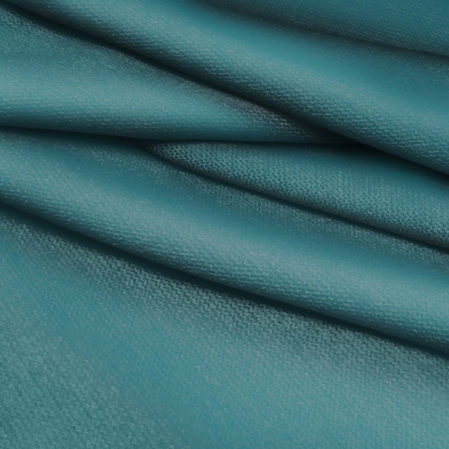 La tela base es el Punto Jersey de Tacto Algodón - Atenas, con una composición de 81% de POLIÉSTER, 15% de ACRÍLICO y 4% de ELASTANO. El color liso impreso es un Azul Verde Azulado medio, según el contenido del CMYK del color, que es de 80 40 47 29. Este color combina con otros tonos fríos como el Gris y el Plateado. El tejido está impreso con el color liso a una sola cara por impresión digital textil, que no es un tejido tintado sino impreso por una sola cara.