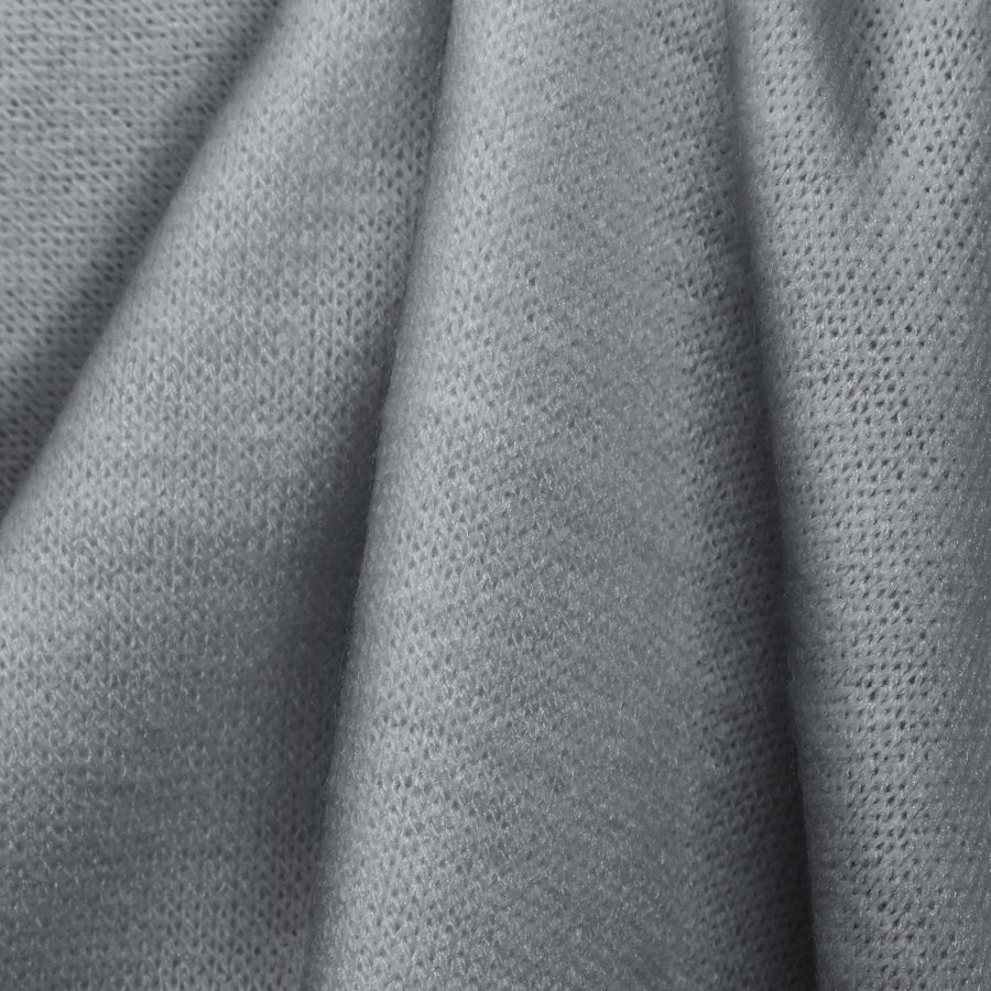 La tela base es el Punto Jersey de Tacto Algodón - Atenas, compuesta por un 81% de poliéster, 15% de acrílico y 4% de elastano, con un gramaje de 239 gr/m2 y una anchura de 150 cm. El color liso impreso es gris agua, con un CMYK de 12 6 5 0, siendo la tinta Cyan la más predominante. Este tono de gris se caracteriza por tener una gran suavidad y ser muy elegante, lo que lo hace ideal para prendas de moda como cardigans o tops.