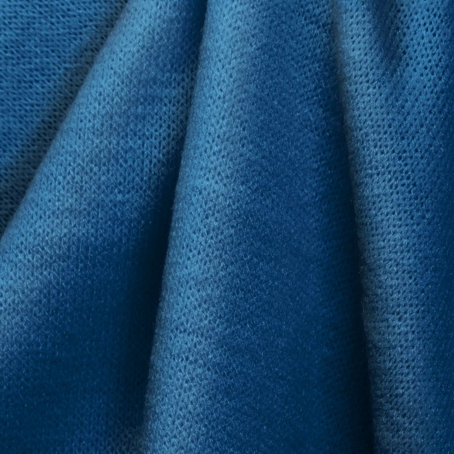 La tela base es el Punto Jersey de Tacto Algodón - Atenas, con una composición de 81% poliéster, 15% acrílico y 4% elastano, un gramaje de 239 gr/m2 y un ancho de 150 cm. El color liso impreso es un azul zafiro con un contenido de CMYK de 98 67 20 5. Este color irradia una sensación de confianza, sabiduría y profundidad emocional. Se puede combinar con tonos neutros como el marrón o el blanco y tonos cálidos como el naranja o el amarillo.