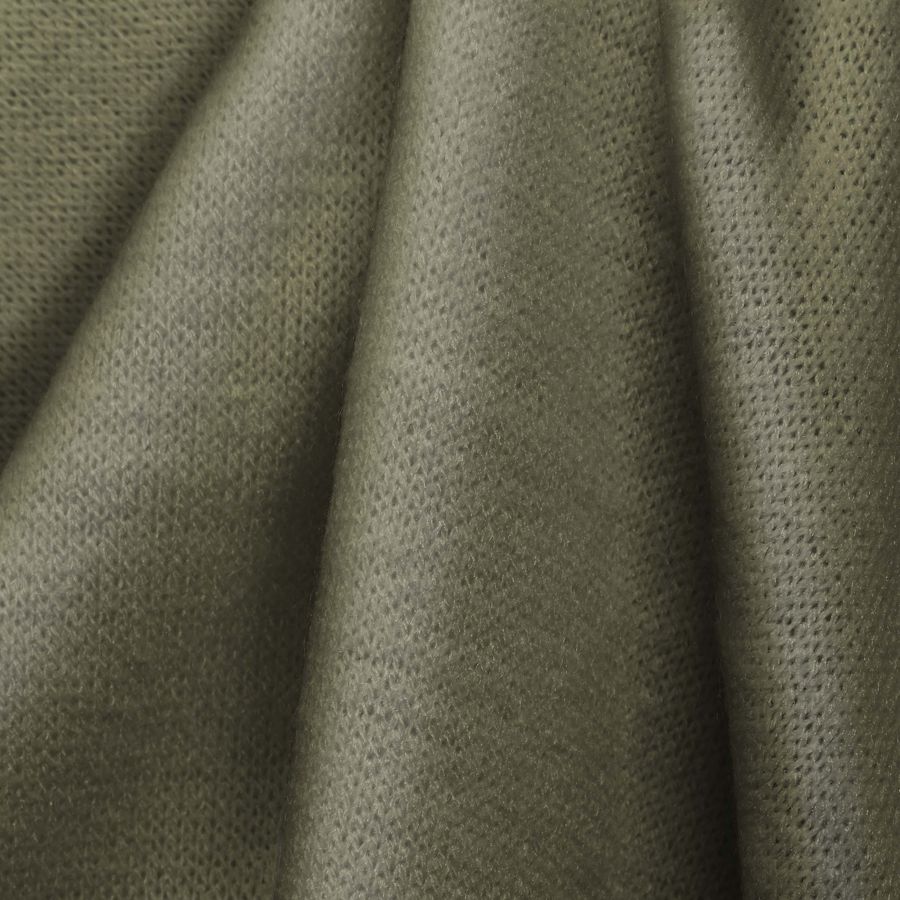 La tela base es el Punto Jersey de Tacto Algodón - Atenas, una tela de punto con una composición de 81% poliéster, 15% acrílico y 4% elastano, un gramaje de 239 gr/m2 y una anchura de 150 cm. El color liso impreso es un verde camuflaje representado en el CMYK: 32 24 48 7. Este color transmite fuerza, determinación y seguridad, siendo perfecto para prendas de moda y de hogar. Combinada con otros tonos de verdes, grises y marrones crea un aspecto natural que evoca el aire libre.