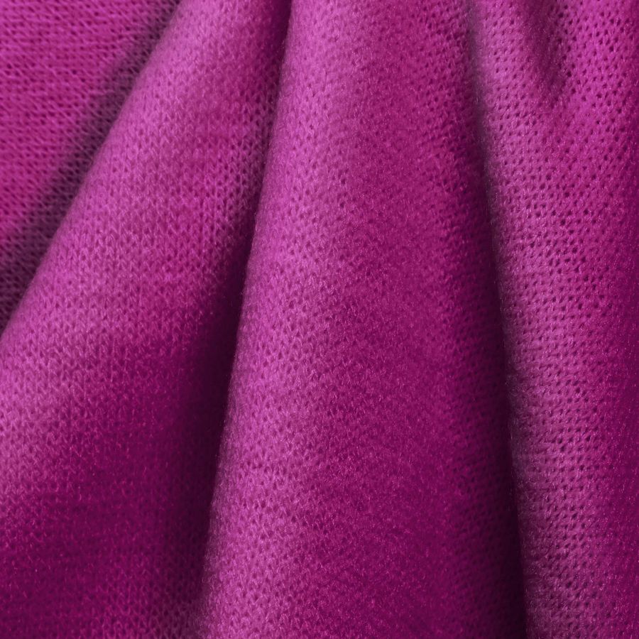 La tela base del tejido es el Punto Jersey de Tacto Algodón - Atenas, compuesta por 81% POLIÉSTER, 15% ACRÍLICO, 4% ELASTANO, con un gramaje de 239 gr/m2 y un ancho de 150 cm. El color liso impreso en la tela tiene una tonalidad Morado ciruela rosa con tinta Cyan de 35, magenta de 100, yellow de 1, y un porcentaje de negro de 1. Esta combinación de tintas da como resultado un color de aspecto vibrante y atractivo, asociado a la creatividad, la pasión y la originalidad. El morado ciruela rosa se combina armoniosamente con colores neutros como el blanco y el negro, y también funciona bien con tonos cálidos como el amarillo y el naranja.