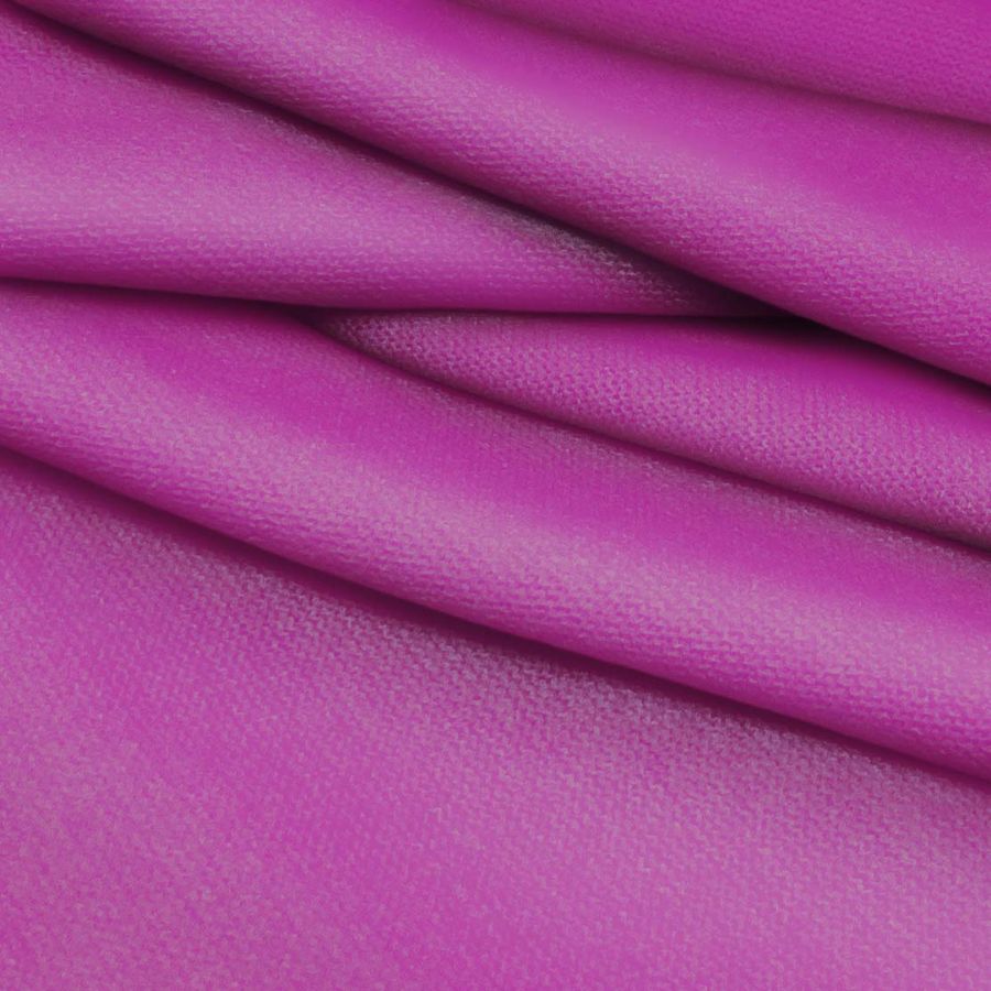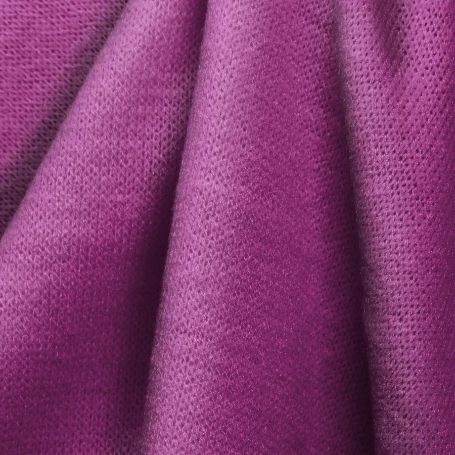 La textura de la tela base es suave y elástica, lo que la hace ideal para prendas como pijamas, jerseys, vestidos y cardigans, así como accesorios como calcetines, fulares y bufandas. La tela es adaptable a la silueta del cuerpo y se siente cómoda al contacto con la piel. El color liso Morado Ciruela Rosa aporta un toque de singularidad y originalidad a la prenda, destacando sobre otros tonos más convencionales.
