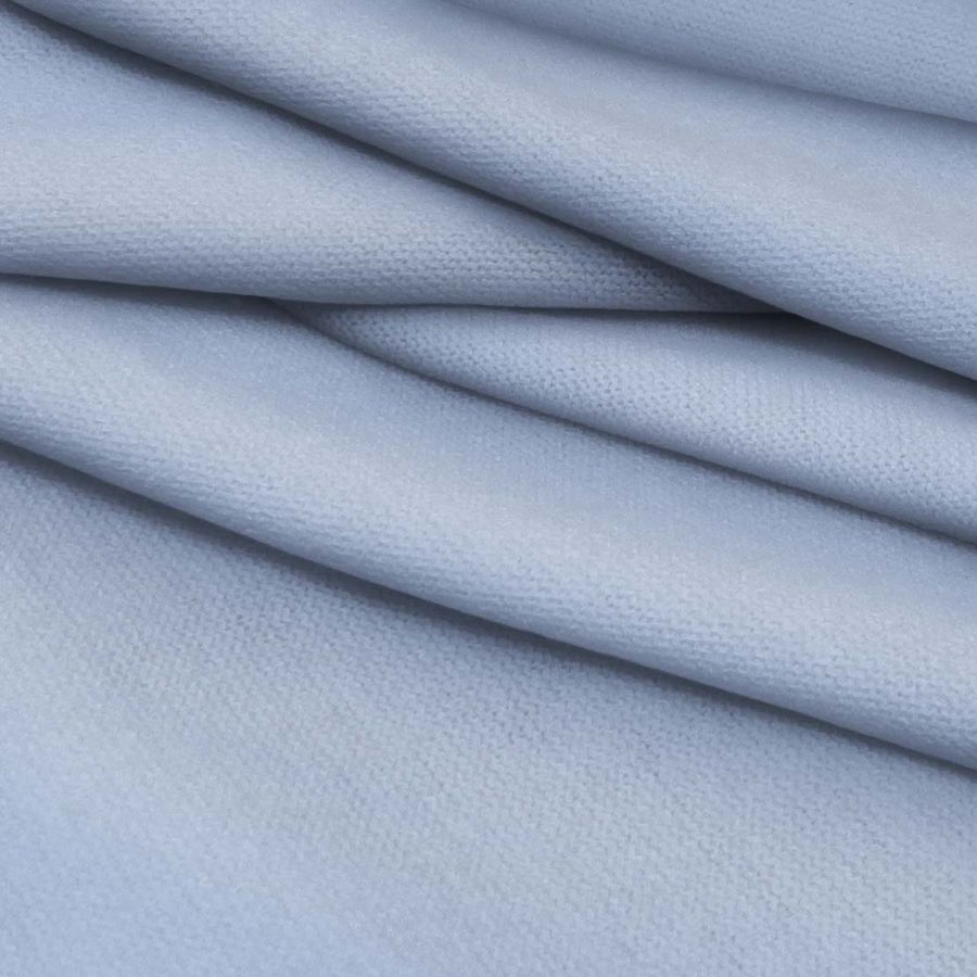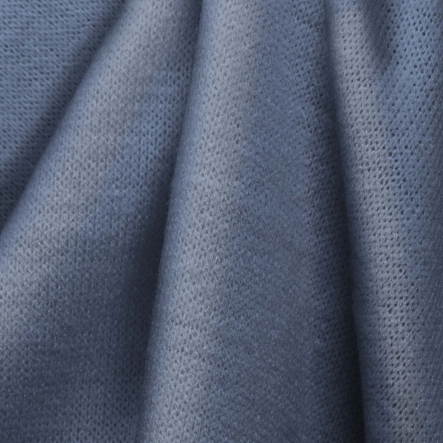 La tela base es el Punto Jersey de Tacto Algodón - Atenas, con una composición de 81% poliéster, 15% acrílico y 4% elastano, que le otorga una textura suave y elástica. El color liso impreso es Azul aciano, con un CMYK de 42 25 3 0. El color combina perfectamente con tonos blancos, grises y beige.