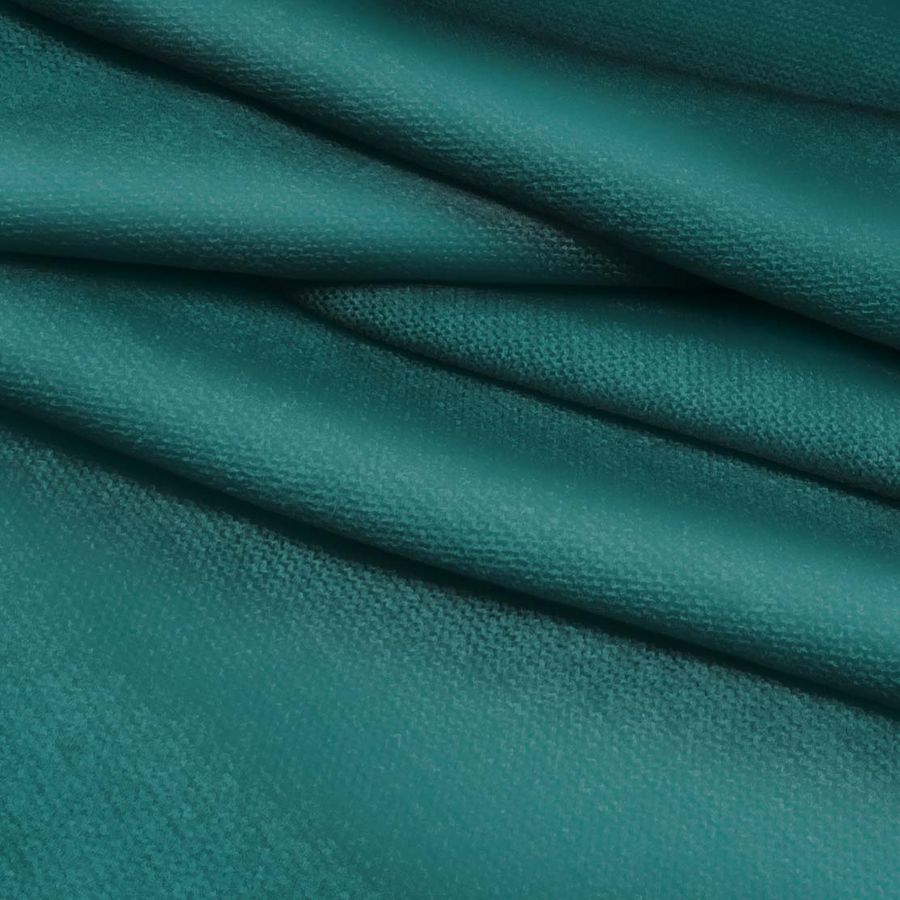 La tela base es el Punto Jersey de Tacto Algodón - Atenas, compuesta por 81% poliéster, 15% acrílico y 4% elastano, con un gramaje de 239 gr/m2 y un ancho de 150 cm. El color liso impreso es un verde azulado medio, cuyo CMYK es de 89 40 56 40. Este color transmite una sensación de frescor y tranquilidad, combinando bien con tonos claros y oscuros como el blanco y el gris. La tela está impresa con el color liso a una sola cara mediante impresión digital textil.
