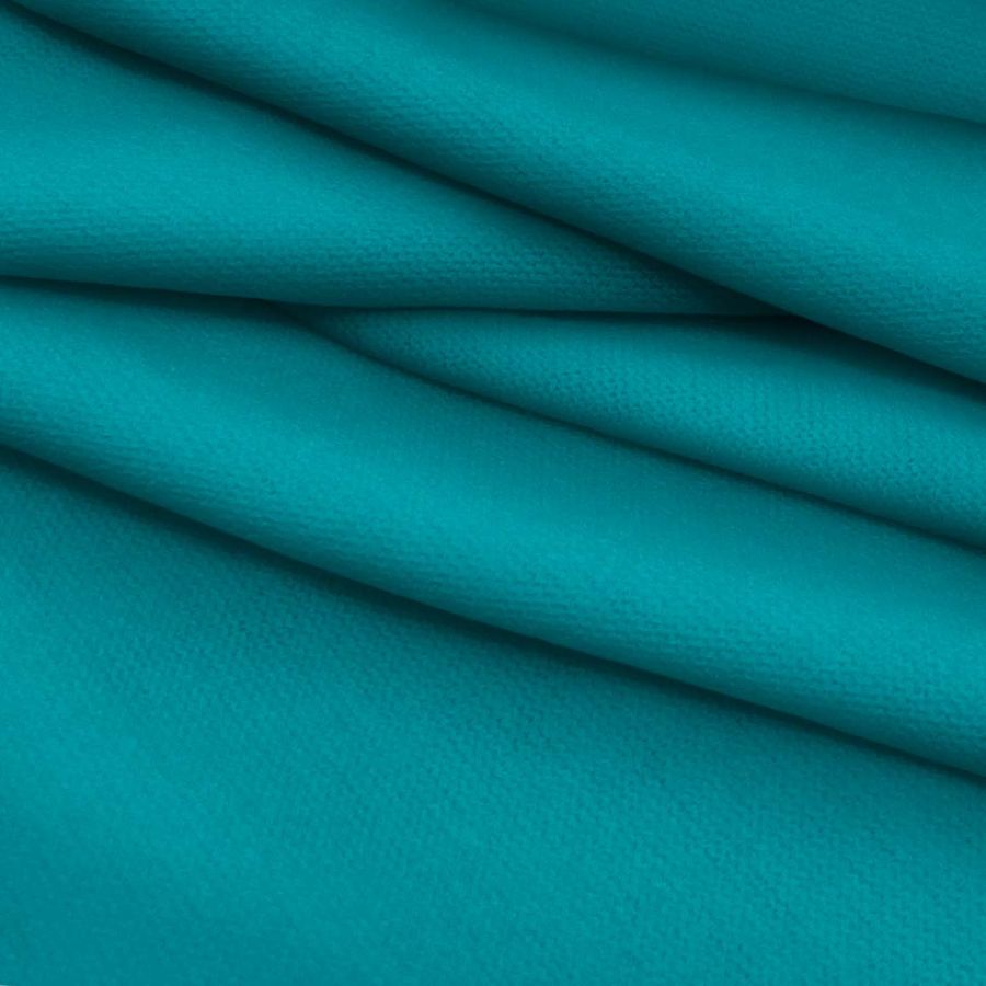La tela base es el Punto Jersey de Tacto Algodón - Atenas, compuesta principalmente por poliéster, acrílico y elastano con un gramaje de 239 gr/m2 y un ancho de 150 cm. El color liso impreso es una tonalidad verde azulada con un CMYK de 85 31 42 17, característica que aporta a la tela un aspecto moderno y fresco. Este color secundario crea una sensación de vitalidad y armonía que evoca la naturaleza y el mar. El verde azulado se combina especialmente bien con tonalidades como el amarillo, el blanco y el gris.