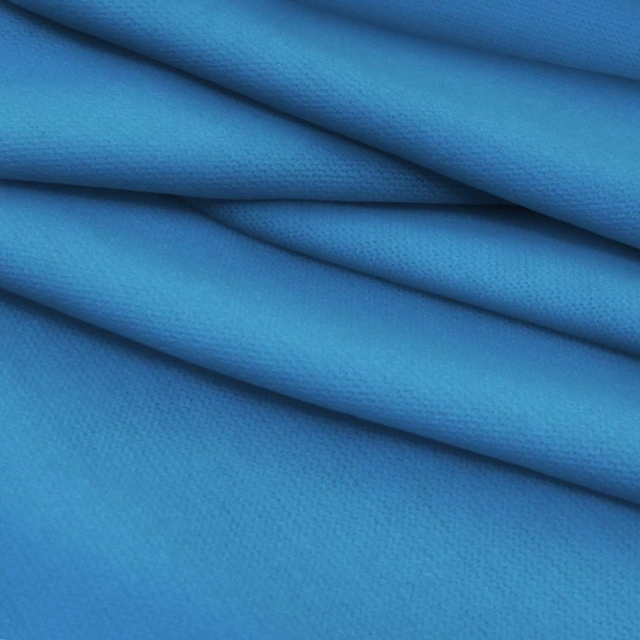 La tela base es Punto Jersey de Tacto Algodón - Atenas, compuesta por 81% POLIÉSTER, 15% ACRÍLICO, 4% ELASTANO, con un gramaje de 239 gr/m2 y un ancho de 150 cm. El color liso impreso es Azul Windows, cuyos atributos de color son 81 de tinta Cyan, 48 de tinta Magenta, 4 de tinta Yellow y 0 de tinta Black, con un CMYK de 81 48 4 0. Este color secundario es evocador de la tranquilidad y la serenidad que transmite el mar, y combina fácilmente con tonos grises, blancos, amarillos y rosados. Es importante resaltar que la tela está impresa con este color liso únicamente en una cara gracias a la impresión digital textil.