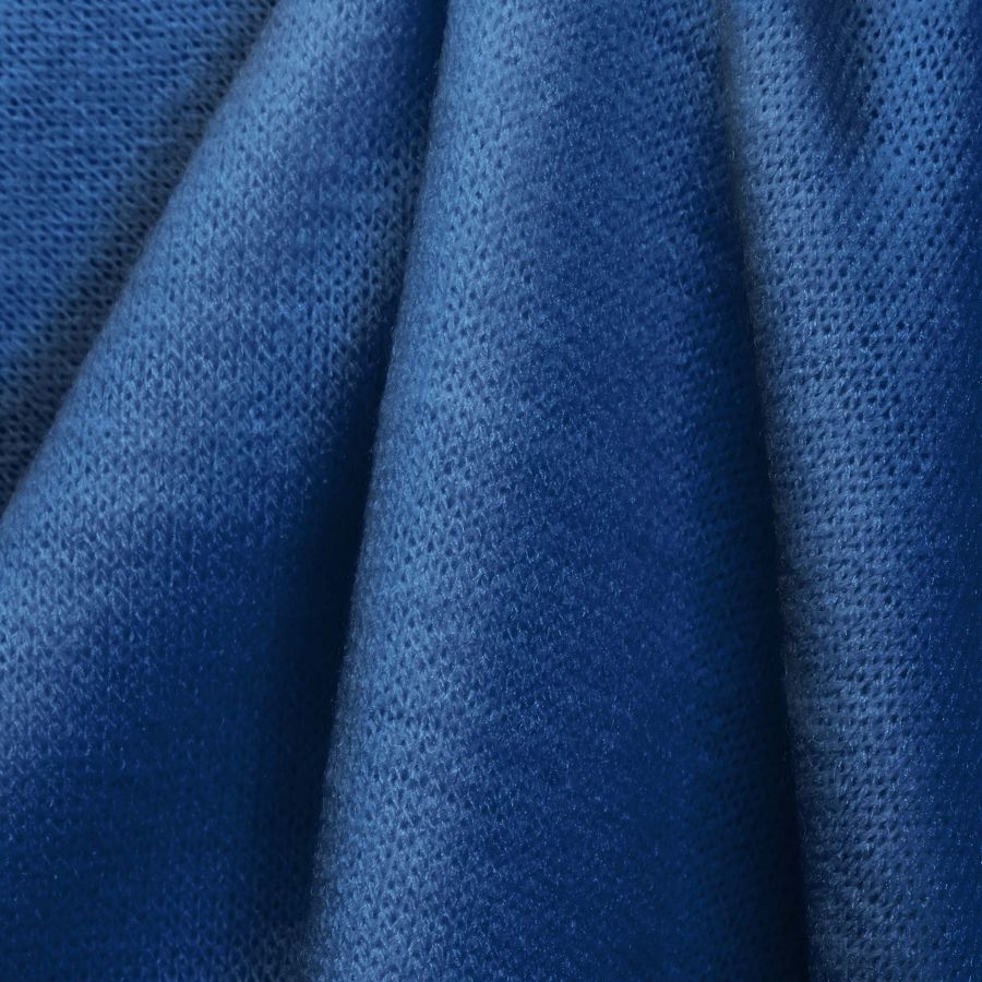 La tela base de la que hablamos es el Punto Jersey de Tacto Algodón - Atenas, compuesta mayoritariamente por poliéster y con un gramaje de 239 gr/m2. El color liso impreso es un azul arándano, con un contenido de tinta cyan del 100, magenta del 77, yellow del 13 y black del 2, lo que le da una gran intensidad cromática. Este color simboliza la estabilidad, la confianza y la lealtad, y técnicamente se suele utilizar en la industria téxtil para prendas de vestir no solo en invierno, sino también en primavera y verano para aportar vitalidad y fuerza. Combina a la perfección con tonalidades neutras como el blanco, el crudo y el negro, pero también puede funcionar en combinaciones arriesgadas con tonos más cálidos como el naranja o el rojo.
