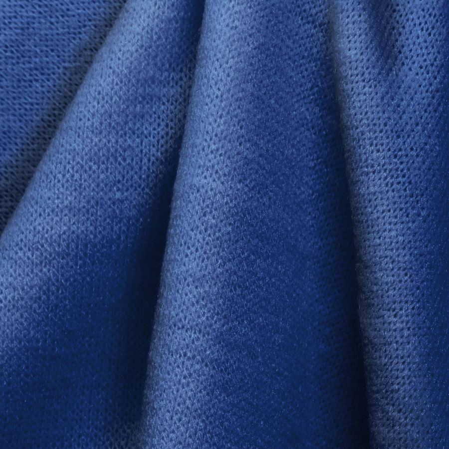 La tela base es el Punto Jersey de Tacto Algodón - Atenas, con una composición de 81% poliéster, 15% acrílico y 4% elastano, un gramaje de 239 gr/m2 y un ancho de 150 cm. El color liso impreso es un vibrante tono de azul arándano con un CMYK de 97 77 6 0. Este color evoca la profundidad y la claridad del agua en un día de verano, y se combina perfectamente con tonos tierra como el marrón y el beige.