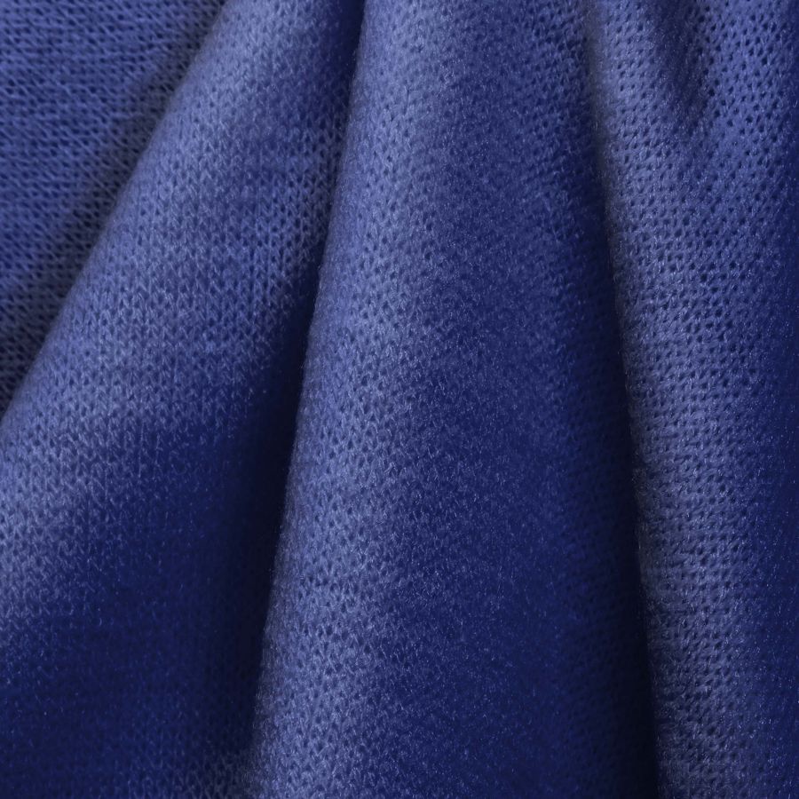 La tela base es el Punto Jersey de Tacto Algodón - Atenas, con una composición de 81% poliéster, 15% acrílico y 4% elastano, un gramaje de 239 gr/m2 y un ancho de 150cm. El color liso impreso es Azul, Azul marino y Azul marino con un contenido de CMYK de 100 90 15 2. Este color secundario, al ser la combinación de diferentes tonalidades de azul, simboliza la estabilidad y la serenidad, aportando una sensación de calma y relajación. El Azul marino es un color elegante y sofisticado que combina perfectamente con tonalidades de blanco y beige, así como con otros tonos de azul más claros.