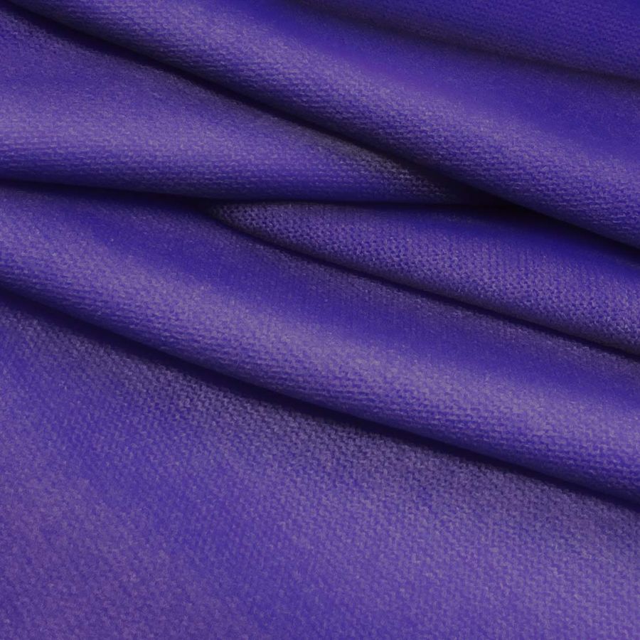 La tela base es Punto Jersey de Tacto Algodón - Atenas, una tela de punto compuesta por 81% poliéster, 15% acrílico y 4% elastano, con un gramaje de 239 gr/m2 y 150 cm de ancho. El color liso impreso es Morado, Monstruo morado, con una combinación de tintas CMYK: 94 100 11 3. Este color secundario se define por su presencia vibrante, llena de fuerza y energía, generando un impacto visual inmediato. Simboliza la creatividad, el misterio y la extravagancia, destacando en combinación con tonos grises, rojos y verdes.