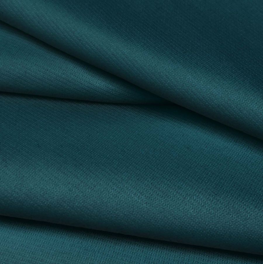 La tela base es la Punto Roma Elástico - Lyon, una tela de punto compuesta por un 97% de poliéster y un 3% de elastano, con un gramaje de 282 gr/m2 y un ancho de 150 cm. Su color liso impreso es un tono verde profundo con un toque de teal. El CMYK del color es de 96 58 50 50, lo que indica una predominancia de cian y una menor cantidad de magenta, amarillo y negro.