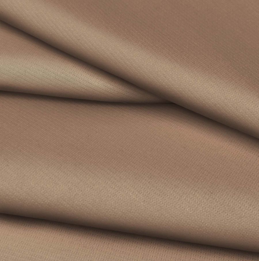 La tela base es Punto Roma Elástico - Lyon, una tela de punto compuesta por 97% poliéster y 3% elastano con un gramaje de 282 gr/m2 y un ancho de 150 cm. El color liso impreso es un Marrón Oso Café con una medida CMYK de 29 44 53 20. Este color tiene un tono terroso, simbolizando la estabilidad y la esencia de la tierra. Se combina perfectamente con tonos beige, marrones más claros, verdes bosque y crudos.