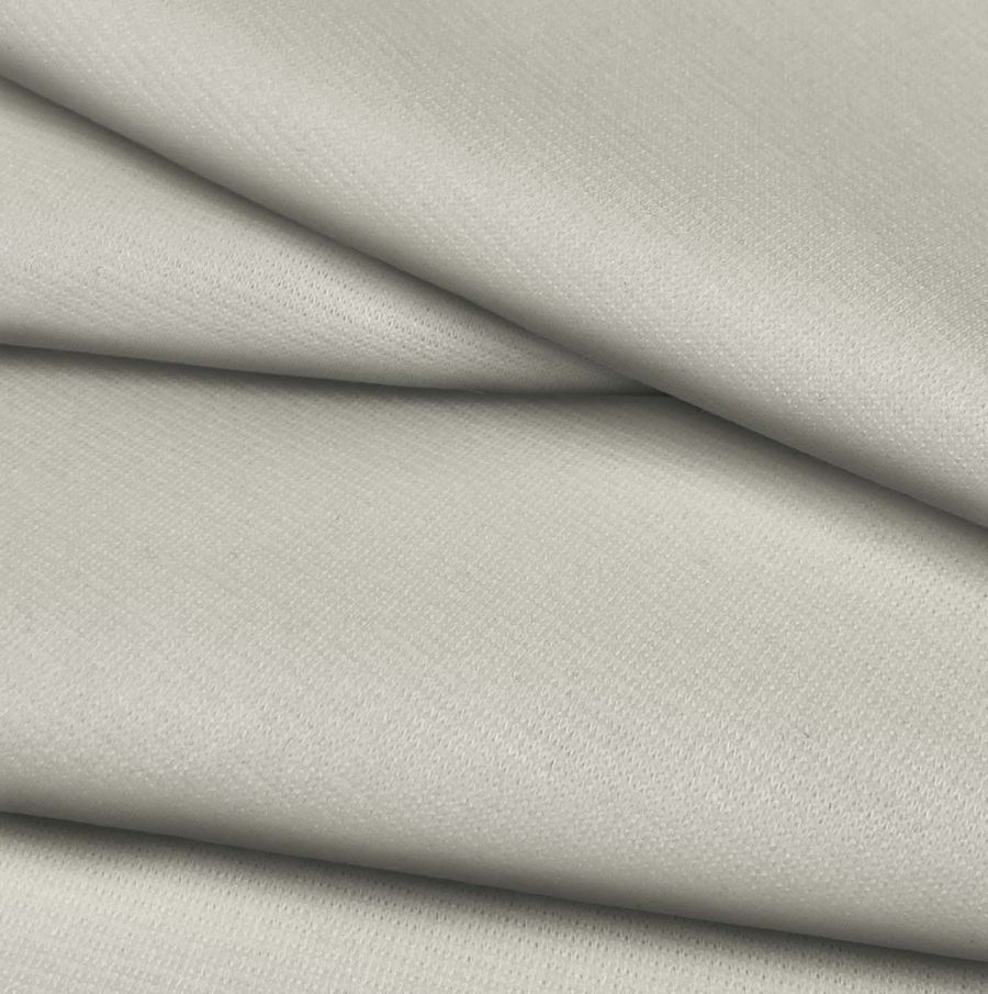 La tela base, Punto Roma Elástico - Lyon, es una tela de punto compuesta por 97% poliéster y 3% elastano, con un gramaje de 282 gr/m2 y un ancho de 150 cm. El color liso impreso en esta tela es Crudo/Ceniza Blanca, con una tinta cyan de 16, magenta de 9, yellow de 23 y black de 0, lo que resulta en un CMYK de 16 9 23 0. Este color secundario es una mezcla elegante y sofisticada de tonos crema y gris que da como resultado un tono neutro ideal para todo tipo de prendas. Se combina perfectamente con tonos dorados, plateados, negros y grises oscuros, así como con tonos pastel suaves como el rosa pálido, el azul celeste y el verde menta.