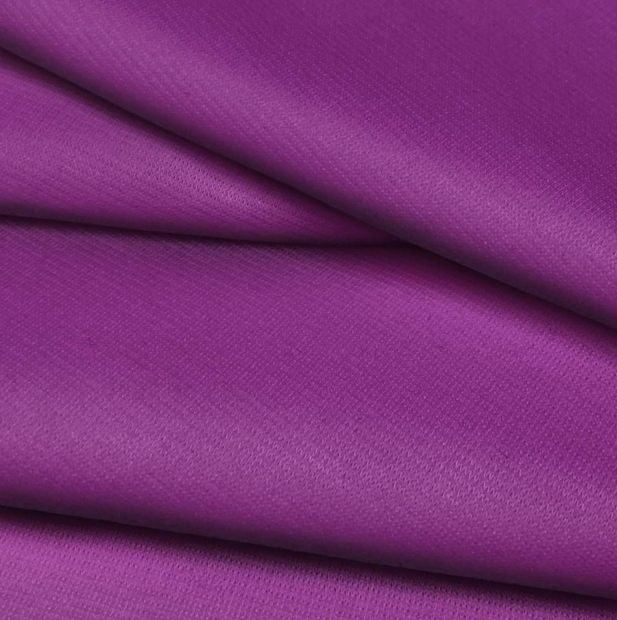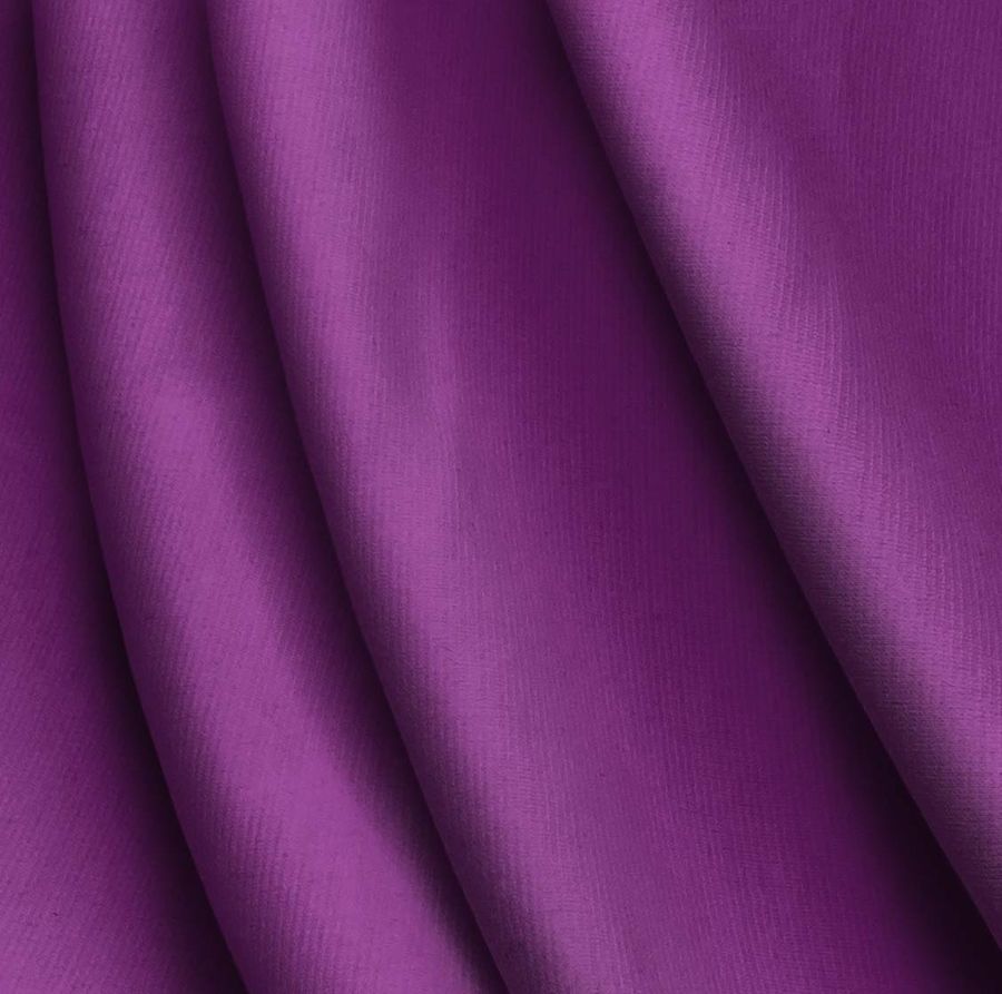 La tela base es Punto Roma Elástico - Lyon, de 282 gr/m2 y 97% poliéster y 3% elastano. El color liso impreso es morado/púrpura con CMYK de 58 95 2 0. Este tono transmite sofisticación y creatividad, combina bien con tonos pastel y con tonos metálicos como el oro y la plata.