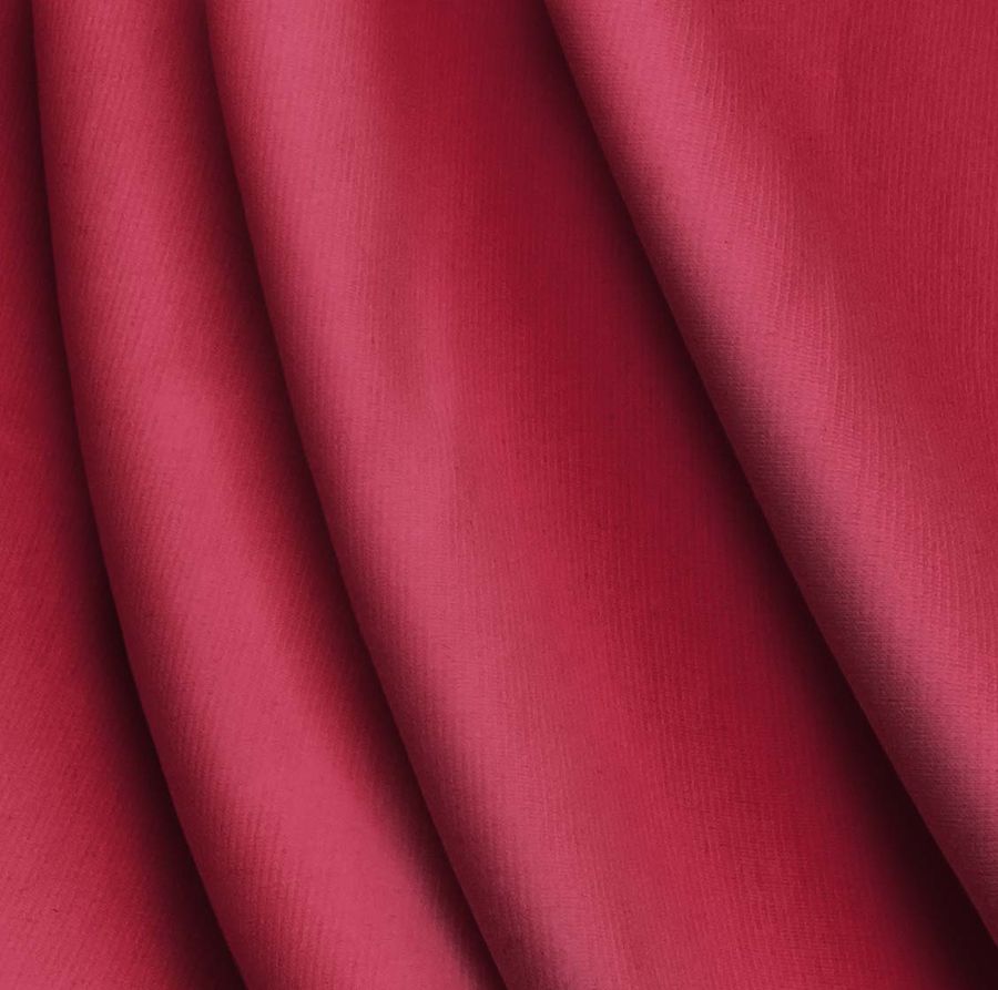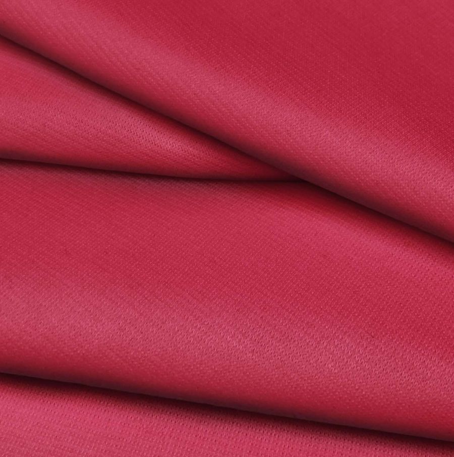 La tela base es el Punto Roma Elástico - Lyon, una tela de punto compuesta por 97% poliéster y 3% elastano con un gramaje de 282 gr/m2 y un ancho de 150 cm. El color liso impreso es un rojo granate brillante, con un CMYK de 17 95 58 7. Este color es llamativo y vibrante, creando un contraste audaz con otros colores fríos como el azul oscuro y el verde oliva.