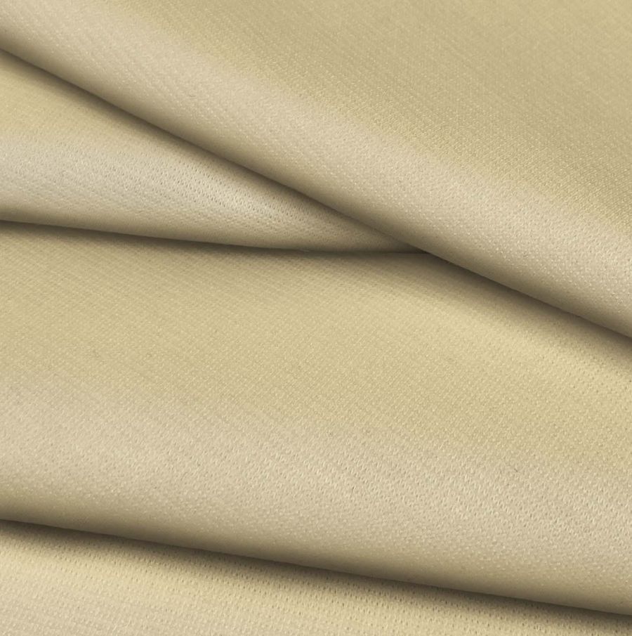La tela base, Punto Roma Elástico – Lyon, es una tela de punto compuesta por 97% poliéster y 3% elastano, con un gramaje de 282 gr/m2 y un ancho de 150 cm. El color liso impreso es un amarillo con tonos de macarrones con queso, resultando en un CMYK de 7 15 43 0. La tela está impresa a una sola cara por impresión digital textil. La tela tiene una textura suave al tacto, junto con características elásticas debido a su composición con elastano.